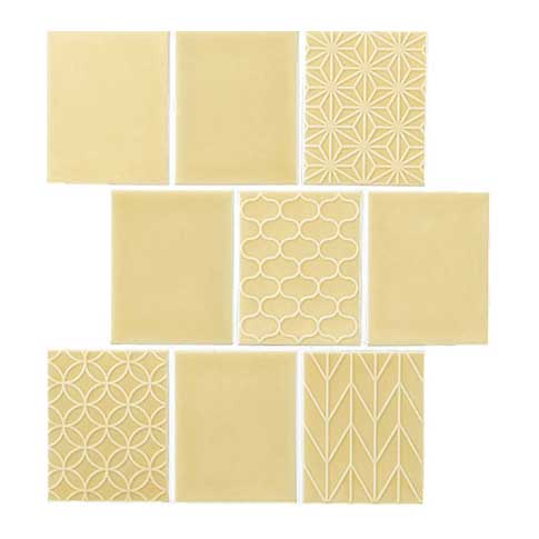 透明感のある釉薬のゆらぎの中に和の古典柄をモダンにアレンジ。レトロな雰囲気が映えるデザインタイルです。 商品の留意点 ●100×80mm角セット(レリーフ)は1ケースの中に4種類の柄が1枚づつ同梱されています。特定の柄を指定しての発注およびバラ出荷はできませんので、ご了承ください。 ●色番によって色幅の大きさが異なります。 ●100×80mm角平(フラット)もネット張り品同様の色幅があります。 ●100×80mm角ネット張りA(馬踏目地)と100×80mm角ネット張りB(馬踏目地)は、混ぜて張ることをお薦めします。 施工上のご注意 ●100×80mm角ネット張りA・B(馬踏目地)は、推奨施工パターン図を参照の上、施工してください。