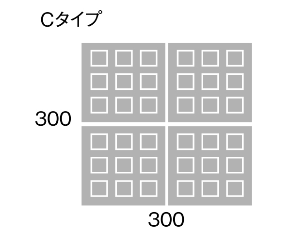 サイズ補足 150mm角スロープタイプC シート目地共寸法 : 300×300mm 裏紙ネット貼り 厚み 9+1.5mm