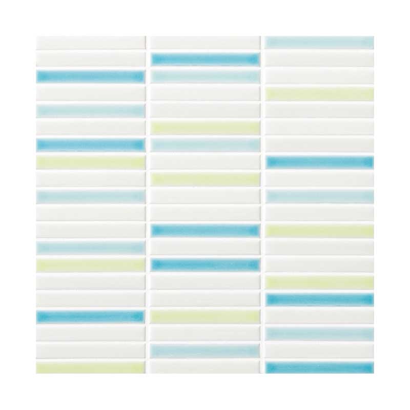 リズミカルなカラーミックスと透明感のある釉薬の質感が明るく爽やかな水回り空間を作ります。 商品の留意点 ●裏ネット張り品です。 ●窯変釉特有の色幅があります。 ●形状・寸法にバラツキがあります。 施工上のご注意 ●出隅部に片面小端施釉(長辺)をご使用の場合、出隅部タイル転び防止板をご使用ください。