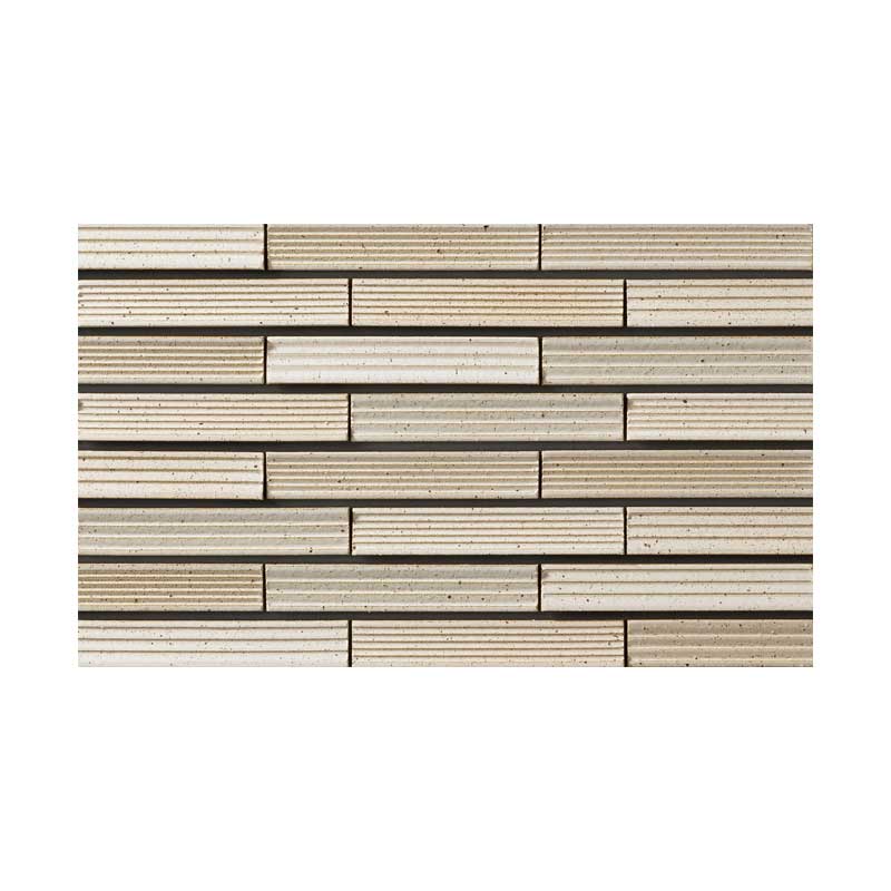 商品の留意点 ●接着剤張り、モルタル施工共用商品です。 ●3本筋と5本筋の2種類の面状を1:1で混合しています。 ●90°曲(接着)は4種類の形状を同梱しています。 ●はるかべ工法での空目地施工の場合、タイル小端面から裏足が見えます。 ●目地幅は縦3mm、横8mmが推奨です。 ●濃色のタイルは虹彩現象が目立つ場合があります。 詳しくはカタログをご参照ください。 ●ランダムに施工いただく場合、タイル上下の方向性や面状があるため、交互あるいは同じ向きで連続して張り続けると偏りやクセが出ることがあります。 パターン図を参照いただくか、仮並べを行い面として確認してからの施工をお薦めします。 ●標準価格およびあたり枚数にロスは含まれていません。 ●キッチンバック等では使用できません。 施工上のご注意 ●表面が凹凸面のため塗り目地はできません。 目地詰めする場合は、1本目地詰めをしてください。 ●1本目地詰めをする場合、タイル側面に目地が付着するため、念入りに酸洗いを実施してください。 ●接着剤は「はるかべ工法専用接着剤」をご使用ください。 ●はるかべ工法の場合、突きつけ目地施工はしないでください。 剥離や欠けの原因になります。 ●モルタル施工の場合、突きつけ目地、空(から)目地施工はしないでください。 剥離や欠けの原因になります。 少なくともタイル長手方向の目地は必ず充填してください。 ●はるかべ工法の場合、漏水等のトラブルを防ぐために、下地側での防水処理(防水紙・防水テープの取付け)を必ず行ってください。 ●タイルの縁や角に尖った部分があるため、強くぶつかるとけがをする可能性があります。