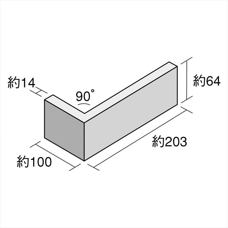 90°曲り 標準寸法:約(203+100)×64mm 厚み:約14mm ※サイズ表示は標準寸法です。ロットにより寸法誤差がありますので、タイル割付けの際はご注意ください。 |