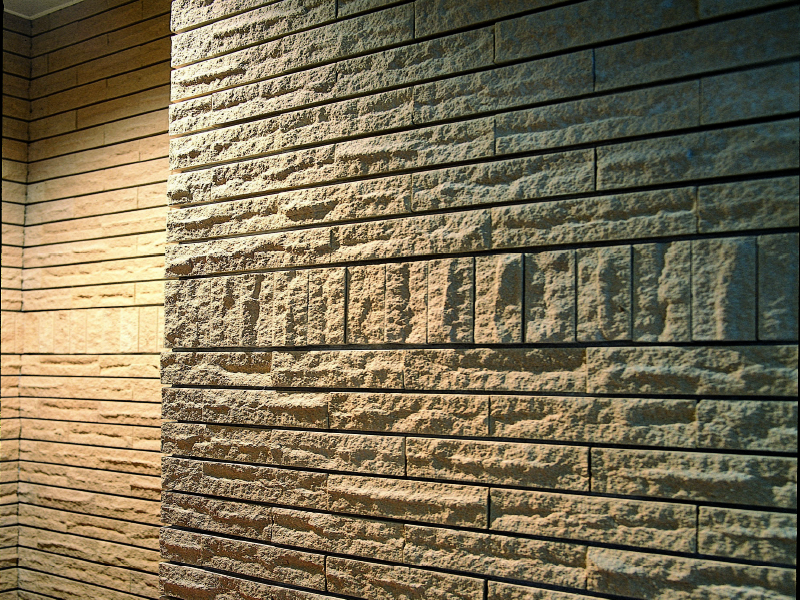 岩石を削り取ったような岩肌のテクスチュア。 壁面を装う演出は、ワイルドな気品。 【注意事項】 ●焼きもの特有の色幅があります。 ●割面のため、厚みに若干のバラツキがあります。 ●役物は全て接着加工となります。 【施工上のご注意】 ●タイル表面にモルタルが付着しないよう十分配慮して施工を行ってください。 ●塗り目地施工はできません。 ●水洗いの際、金属性ブラシのご使用は避けてください。