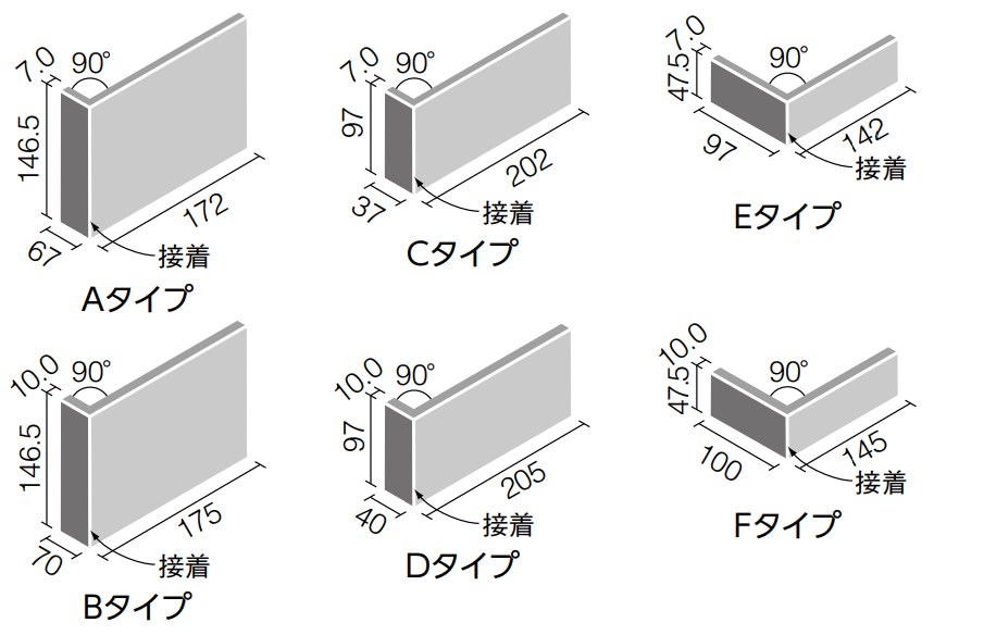 異形状90°曲セット(接着) <実寸法> Aタイプ(172+67)×146.5×厚み7mm Bタイプ(175+70)×146.5×厚み10mm Cタイプ(202+37)×97×厚み7mm Dタイプ(205+40)×97×厚み10mm Eタイプ(142+97)×47.5×厚み7mm Fタイプ(145+100)×47.5×厚み10mm |