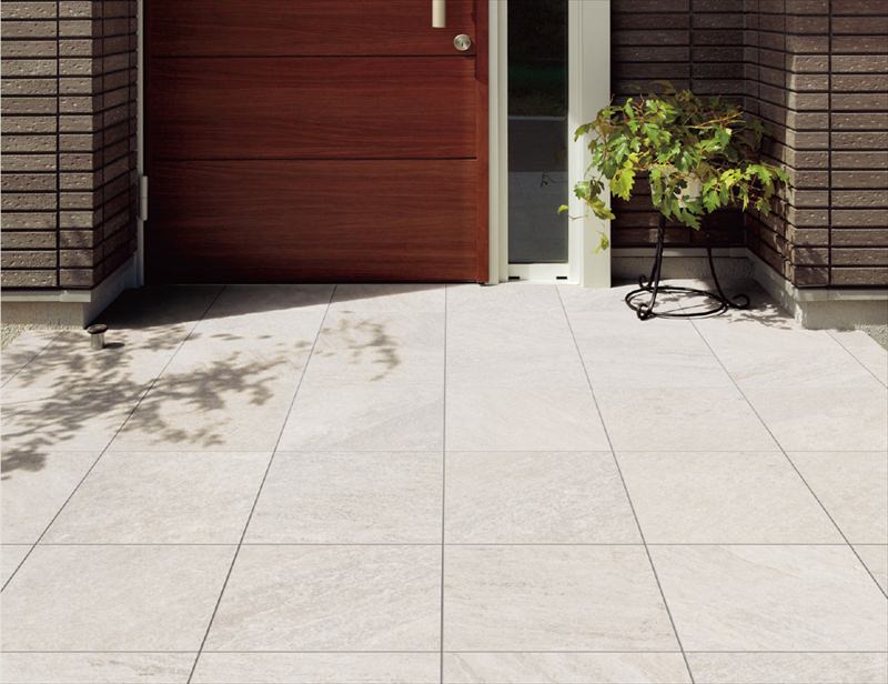 クォーツサイト特有の自然な色、柄バラツキが特長である有色素地の内外床タイルです。
