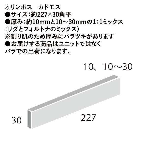 【商品詳細】 オリンポス カドモス ●サイズ:約227×30角平 ●厚み:約10mmと10〜30mmの1:1ミックス(リダとフォルトナのミックス) ※割り肌のため厚みにバラツキがあります ●お届けする商品はユニットではなくバラでの出荷になります。