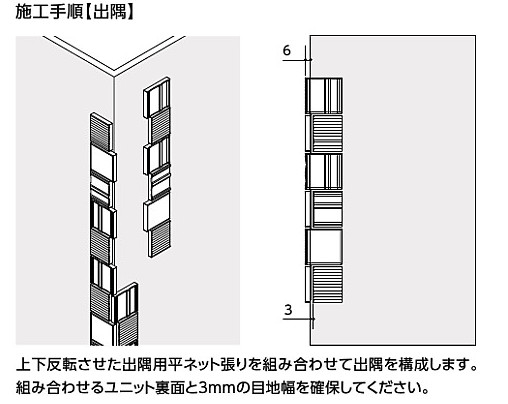 3種類の面状が織りなす陰影感が、端正な住宅の外観を装うタイルです。 <商品の留意点> ●接着剤張り専用商品です。 ●細目地の間から連結材が見えます。タイルの連結材の色はグレーにしていますので、接着剤はG3色をご使用ください。 ●細目地の間から接着剤のクシ目が見えることがあります。 ●ユニット品の設定目地幅は縦・横とも3mmですが、タイル寸法公差等によるバラツキがあります。 ●セラヴィオW・Sとはユニット寸法が異なります。張り合わせる場合は見切り材等をご使用ください。 ●90°屏風曲ネット張り(接着)はフラット面状となっています。 ●切断した場合、小端が白くなる場合があります。補修にはコバ面塗料ウェットタイプ(F‐WCT100)をお使いください。 ●生産ロット単位、形状間、および1枚ごとなどに色合いが異なる場合があります。 ●標準価格およびあたり枚数にロスは含まれていません。 ●キッチンバック等では使用できません。 <施工上のご注意> ●接着剤は「はるかべ工法専用接着剤」をご使用ください。 ●仕上がりが下地精度の影響を受けやすいため、下地調整を行ってください。 ●モルタル施工はしないでください。 裏あし形状はあり状ではないので、剥離の原因となることがあります。 ●突きつけ目地施工はしないでください。 剥離や欠けの原因になります。 ●漏水等のトラブルを防ぐために、下地側での防水処理(防水紙・防水テープの取付け)を必ず行ってください。 ●タイルの縁や角に尖った部分があるため、強くぶつかるとけがをする可能性があります。
