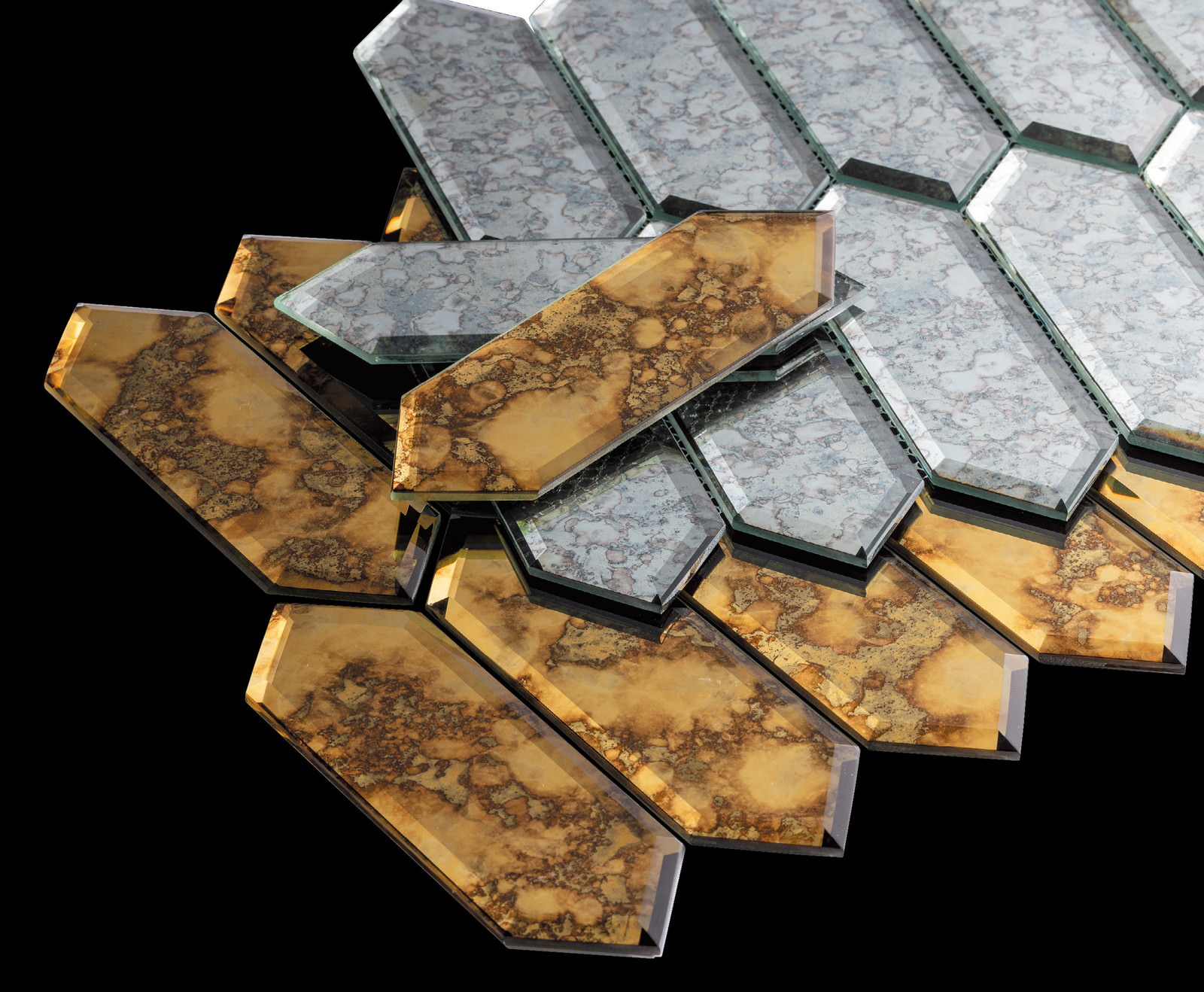 変形六角形状の大きめサイズのガラスモザイクです。ビンテージ調のミラーによる映り込みは空間に馴染みながら広がりを感じさせます。