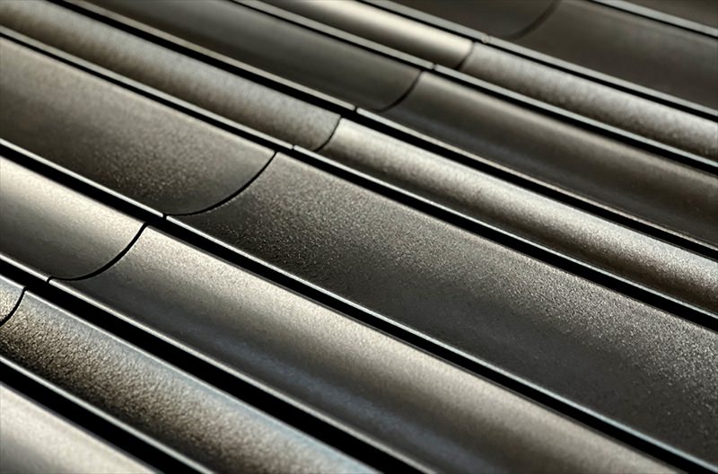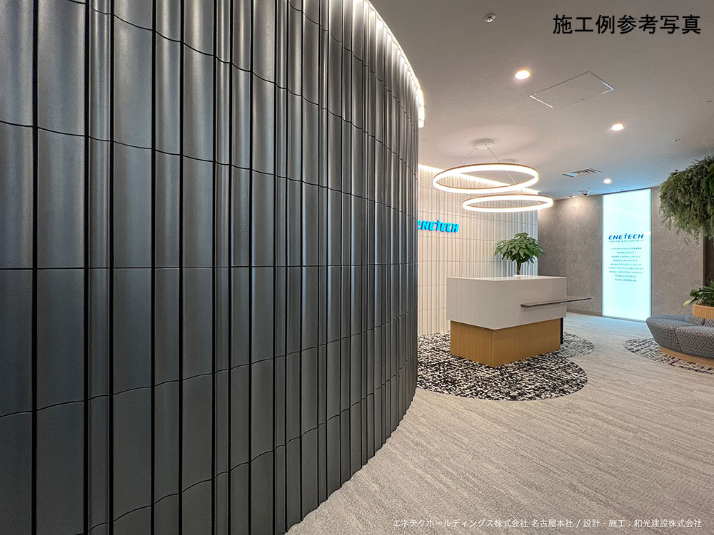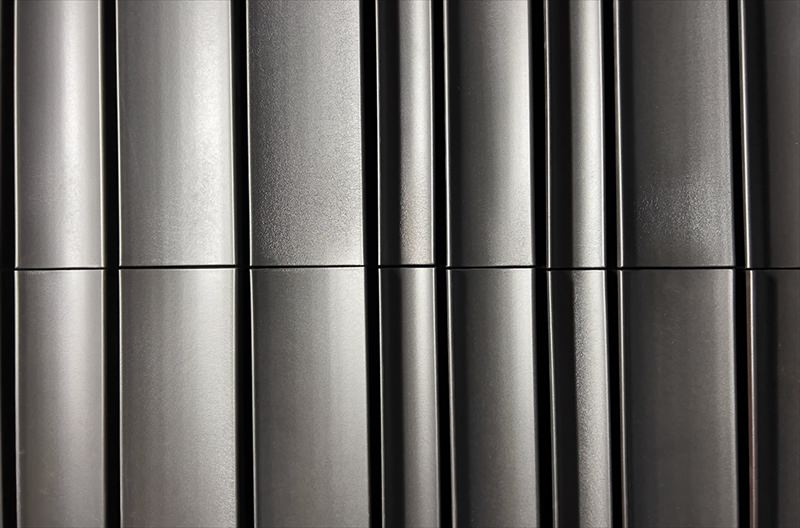 アールにくぼんだ少し長めのボーダータイル。 光を取り込むシンプルな連続性が美しい。 10mm程度の目地間隔がフォルムを際立たせる。