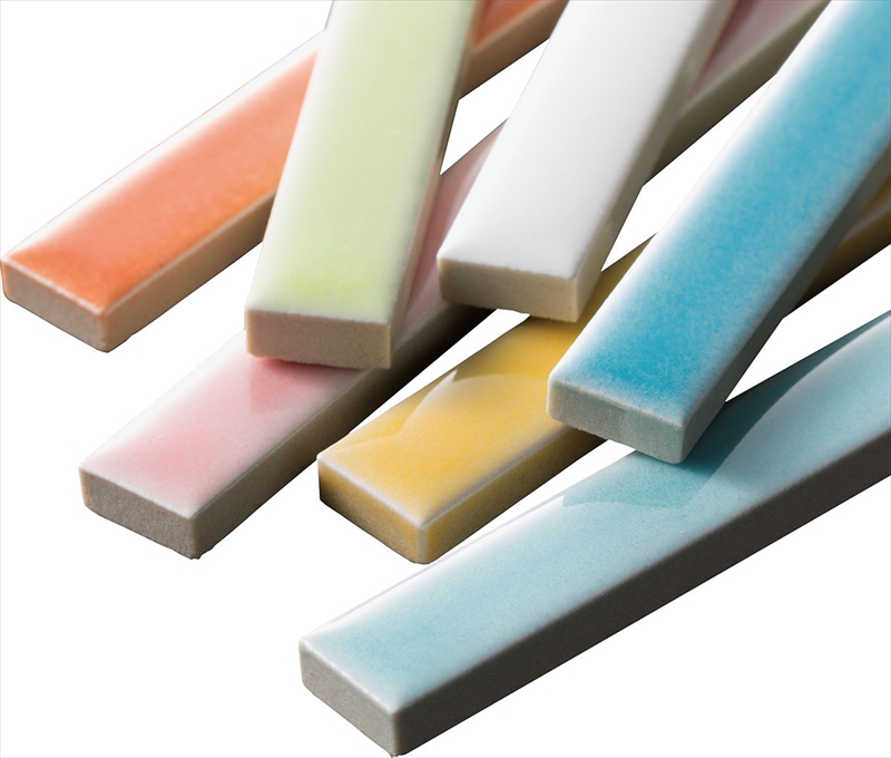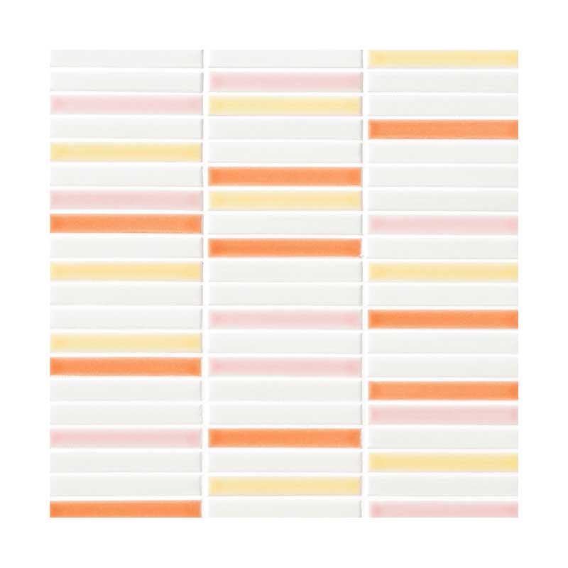 リズミカルなカラーミックスと透明感のある釉薬の質感が明るく爽やかな水回り空間を作ります。 商品の留意点 ●裏ネット張り品です。 ●窯変釉特有の色幅があります。 ●形状・寸法にバラツキがあります。 施工上のご注意 ●出隅部に片面小端施釉(長辺)をご使用の場合、出隅部タイル転び防止板をご使用ください。