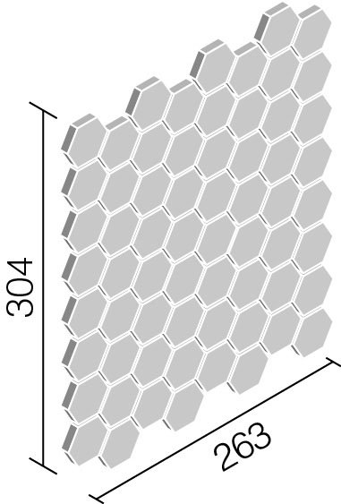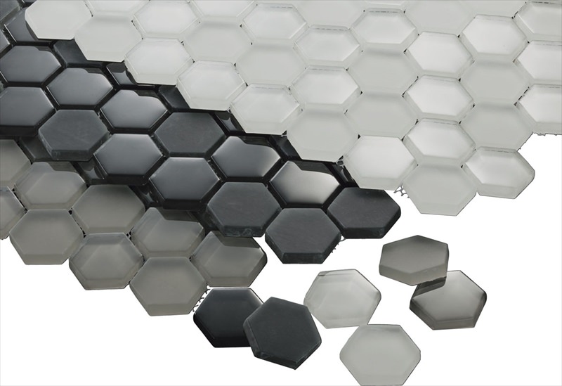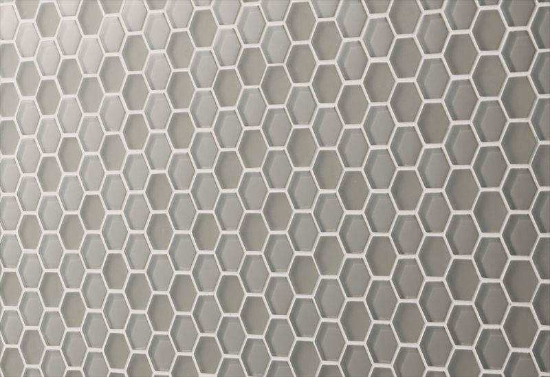 クリアとフロスト2つの表情を持つ六角形(ヘキサゴンタイル)のガラスモザイクです。 異なる反射感の組み合わせにより 空間に動きを演出します。