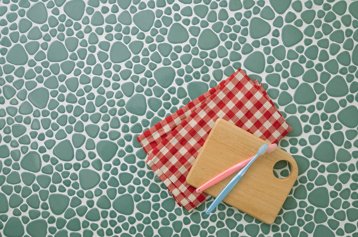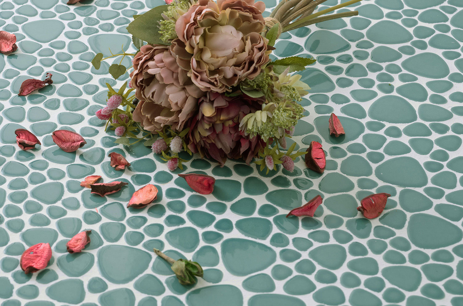 レトロな雰囲気と現代的なデザインを融合させて上品で可愛らしい玉石モザイクタイル。滑らかな丸みが、空間に温かみを添えてます。 ■注意事項■ 生産ロットにより色が異なる場合があります。