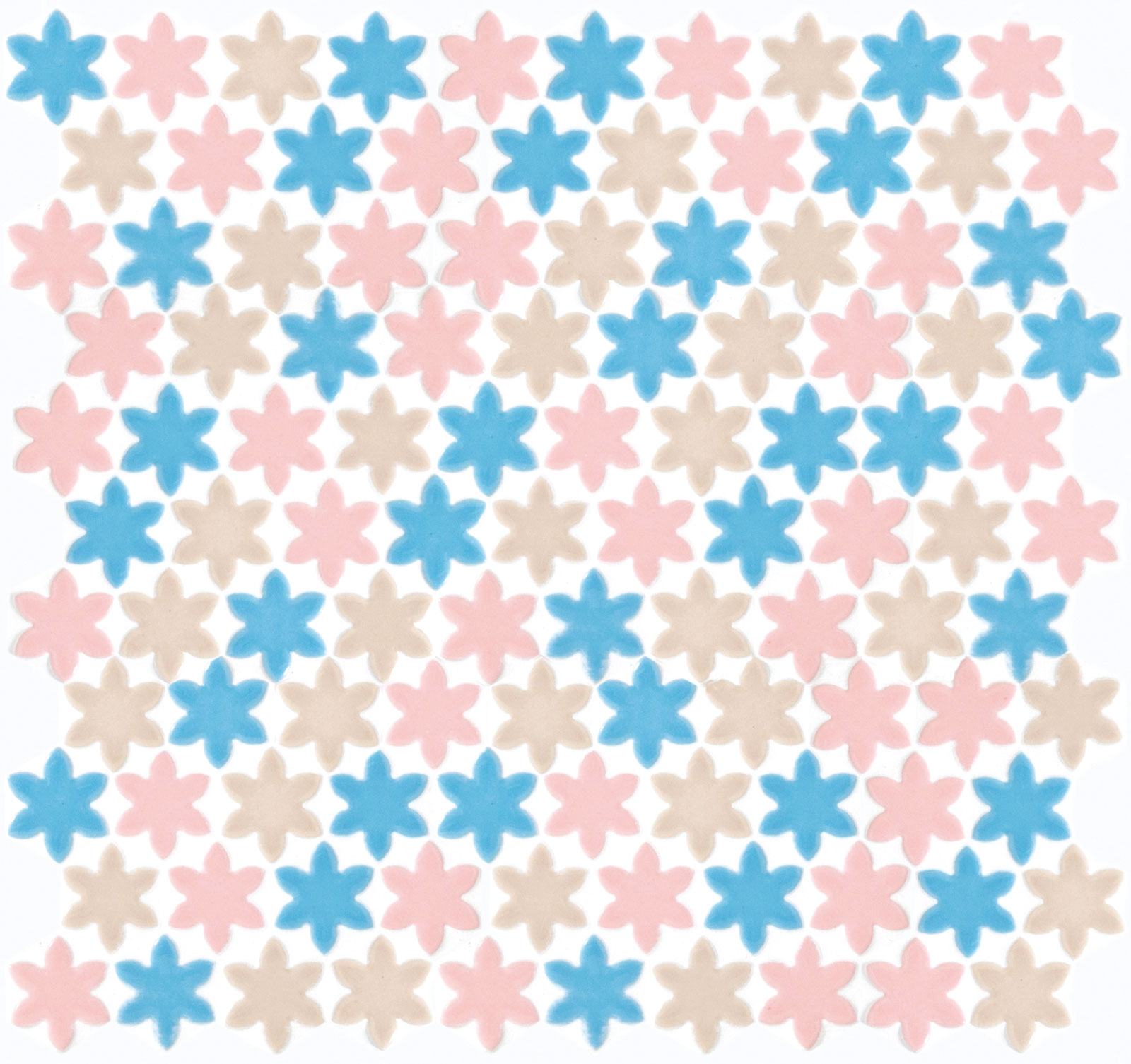 花や星、あなたの想いに変化します。 ■注意事項■ ・加工納期が掛かります。ご注文の際はご確認ください。 ・全ての商品に特有の色ムラと色幅があります。 ・寸法、形状にバラツキがあります。施工時は商品に合った十分な目地幅をお取りください。 ・サンプルと製品ではロット差がありますので、ご注意ください。 ・壁へのご使用は、高さ及び下地に合った接着剤をご使用ください。 ・内装タイル、石材及びガラス製品のメンテナンスには酸性、アルカリ性の洗剤及びクレンザーはご使用にならないでください。 ・石材及びガラス製品、メタリック釉商品には、酸洗いが出来ません。 ・紙貼り商品は、紙剥がし後水洗いを必ず行い、糊を除去したうえで目地施工を行ってください。過度な酸洗いは虹彩現象の原因となります。 ・m2必要数及びm必要数は参考枚数です。目地幅や寸法誤差により異なります。 ・表面テクスチャーにより塗り目地出来ない商品があります。 ・裏ネット商品及び裏ドット商品はネットの色に合った接着剤をご使用ください。 ・黒目地をご使用の場合カーボンや酸化鉄が混入されている為目地残りしやすいです。ご注意ください。