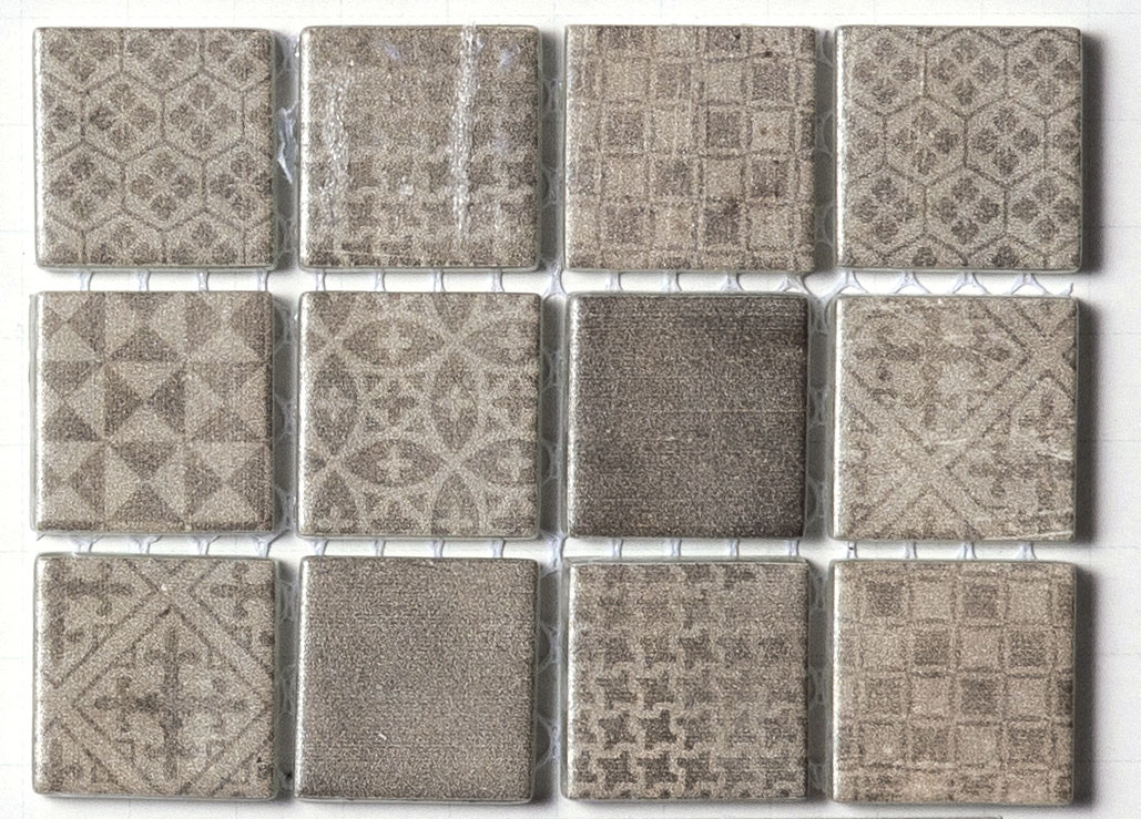 西洋家紋をイメージした柄をガラスモザイクに施しました。 ■注意事項■ ・強くこすると表面の釉薬が剥がれます。ご注意ください。 ・必ずガラスカッターで切断してください。切断後は必ずヤスリで面を取ってください。 ・浴室などの温度差の激しい場所では熱膨張の繰り返しにより破損が生じる可能性がありますのでご使用にならないでください。 ・全ての商品に特有の色ムラと色幅があります。 ・寸法、形状にバラツキがあります。施工時は商品に合った十分な目地幅をお取りください。 ・サンプルと製品ではロット差がありますので、ご注意ください。 ・壁へのご使用は、高さ及び下地に合った接着剤をご使用ください。 ・内装タイル、石材及びガラス製品のメンテナンスには酸性、アルカリ性の洗剤及びクレンザーはご使用にならないでください。 ・石材及びガラス製品、メタリック釉商品には、酸洗いが出来ません。 ・紙貼り商品は、紙剥がし後水洗いを必ず行い、糊を除去したうえで目地施工を行ってください。過度な酸洗いは虹彩現象の原因となります。 ・m2必要数及びm必要数は参考枚数です。目地幅や寸法誤差により異なります。 ・表面テクスチャーにより塗り目地出来ない商品があります。 ・裏ネット商品及び裏ドット商品はネットの色に合った接着剤をご使用ください。 ・黒目地をご使用の場合カーボンや酸化鉄が混入されている為目地残りしやすいです。ご注意ください。
