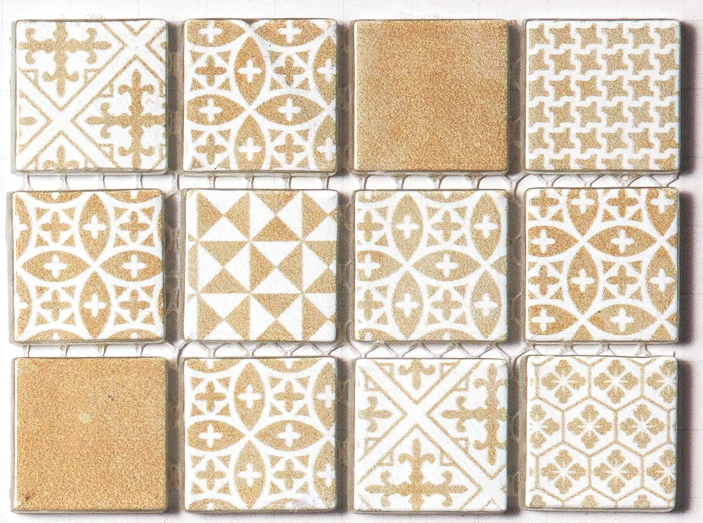 西洋家紋をイメージした柄をガラスモザイクに施しました。 ■注意事項■ ・強くこすると表面の釉薬が剥がれます。ご注意ください。 ・必ずガラスカッターで切断してください。切断後は必ずヤスリで面を取ってください。 ・浴室などの温度差の激しい場所では熱膨張の繰り返しにより破損が生じる可能性がありますのでご使用にならないでください。 ・全ての商品に特有の色ムラと色幅があります。 ・寸法、形状にバラツキがあります。施工時は商品に合った十分な目地幅をお取りください。 ・サンプルと製品ではロット差がありますので、ご注意ください。 ・壁へのご使用は、高さ及び下地に合った接着剤をご使用ください。 ・内装タイル、石材及びガラス製品のメンテナンスには酸性、アルカリ性の洗剤及びクレンザーはご使用にならないでください。 ・石材及びガラス製品、メタリック釉商品には、酸洗いが出来ません。 ・紙貼り商品は、紙剥がし後水洗いを必ず行い、糊を除去したうえで目地施工を行ってください。過度な酸洗いは虹彩現象の原因となります。 ・m2必要数及びm必要数は参考枚数です。目地幅や寸法誤差により異なります。 ・表面テクスチャーにより塗り目地出来ない商品があります。 ・裏ネット商品及び裏ドット商品はネットの色に合った接着剤をご使用ください。 ・黒目地をご使用の場合カーボンや酸化鉄が混入されている為目地残りしやすいです。ご注意ください。