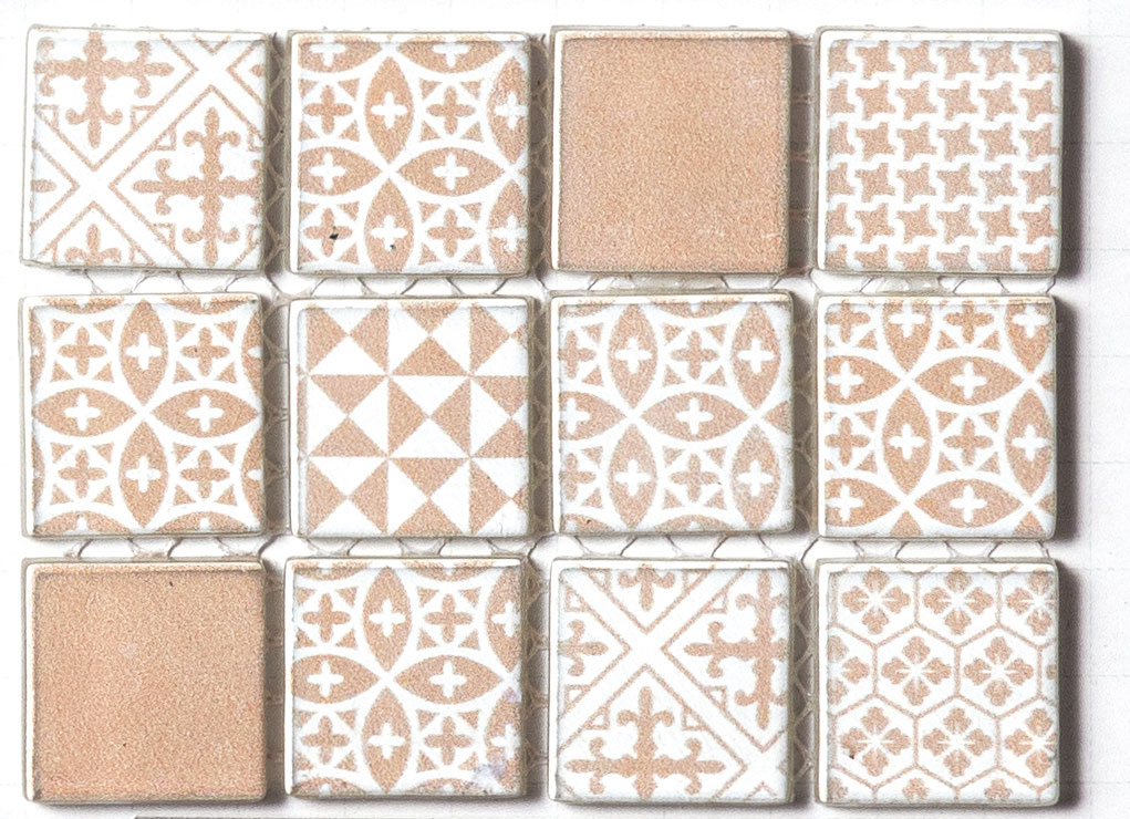 西洋家紋をイメージした柄をガラスモザイクに施しました。 ■注意事項■ ・強くこすると表面の釉薬が剥がれます。ご注意ください。 ・必ずガラスカッターで切断してください。切断後は必ずヤスリで面を取ってください。 ・浴室などの温度差の激しい場所では熱膨張の繰り返しにより破損が生じる可能性がありますのでご使用にならないでください。 ・全ての商品に特有の色ムラと色幅があります。 ・寸法、形状にバラツキがあります。施工時は商品に合った十分な目地幅をお取りください。 ・サンプルと製品ではロット差がありますので、ご注意ください。 ・壁へのご使用は、高さ及び下地に合った接着剤をご使用ください。 ・内装タイル、石材及びガラス製品のメンテナンスには酸性、アルカリ性の洗剤及びクレンザーはご使用にならないでください。 ・石材及びガラス製品、メタリック釉商品には、酸洗いが出来ません。 ・紙貼り商品は、紙剥がし後水洗いを必ず行い、糊を除去したうえで目地施工を行ってください。過度な酸洗いは虹彩現象の原因となります。 ・m2必要数及びm必要数は参考枚数です。目地幅や寸法誤差により異なります。 ・表面テクスチャーにより塗り目地出来ない商品があります。 ・裏ネット商品及び裏ドット商品はネットの色に合った接着剤をご使用ください。 ・黒目地をご使用の場合カーボンや酸化鉄が混入されている為目地残りしやすいです。ご注意ください。
