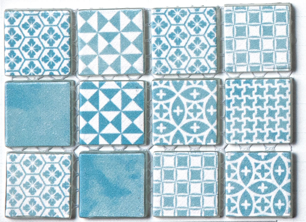 西洋家紋をイメージした柄をガラスモザイクに施しました。 ■注意事項■ ・強くこすると表面の釉薬が剥がれます。ご注意ください。 ・必ずガラスカッターで切断してください。切断後は必ずヤスリで面を取ってください。 ・浴室などの温度差の激しい場所では熱膨張の繰り返しにより破損が生じる可能性がありますのでご使用にならないでください。 ・全ての商品に特有の色ムラと色幅があります。 ・寸法、形状にバラツキがあります。施工時は商品に合った十分な目地幅をお取りください。 ・サンプルと製品ではロット差がありますので、ご注意ください。 ・壁へのご使用は、高さ及び下地に合った接着剤をご使用ください。 ・内装タイル、石材及びガラス製品のメンテナンスには酸性、アルカリ性の洗剤及びクレンザーはご使用にならないでください。 ・石材及びガラス製品、メタリック釉商品には、酸洗いが出来ません。 ・紙貼り商品は、紙剥がし後水洗いを必ず行い、糊を除去したうえで目地施工を行ってください。過度な酸洗いは虹彩現象の原因となります。 ・m2必要数及びm必要数は参考枚数です。目地幅や寸法誤差により異なります。 ・表面テクスチャーにより塗り目地出来ない商品があります。 ・裏ネット商品及び裏ドット商品はネットの色に合った接着剤をご使用ください。 ・黒目地をご使用の場合カーボンや酸化鉄が混入されている為目地残りしやすいです。ご注意ください。