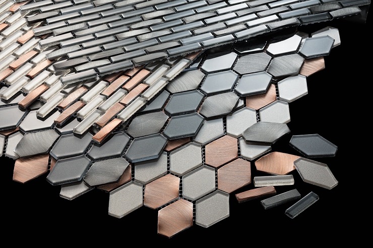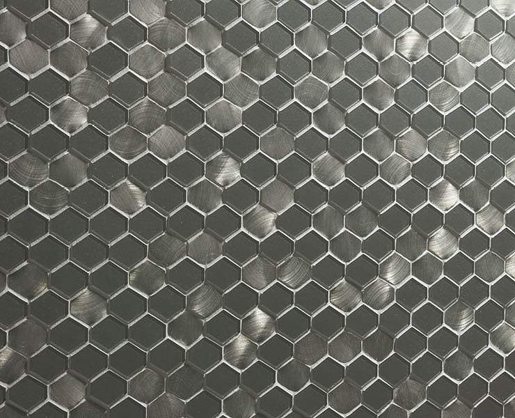 ヘアライン加工された金属とガラスという異なる光沢感を組み合わせたモザイクタイルです。