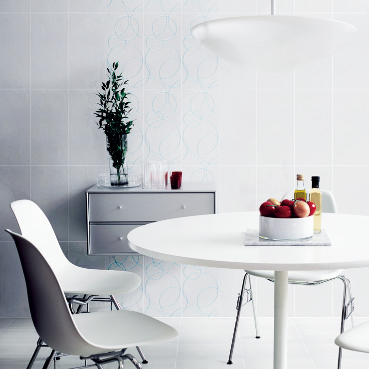 ブライトのホワイト無地、ベーシックな筋柄、ポップなデザイン柄の3種類の表情を持つ内装壁タイルです。
