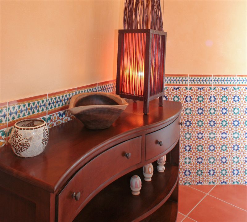 沖縄の別荘のトイレにタイルとステンドグラスで、トロピカルな雰囲気をつくりました。