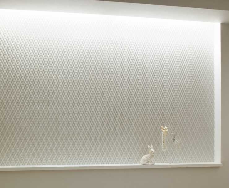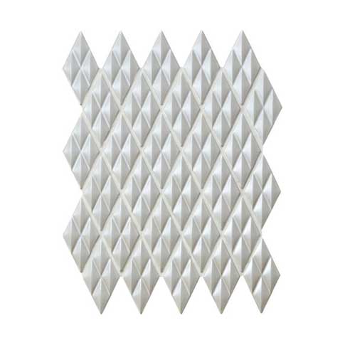 ダイヤ形のタイルにふっくらとしたレリーフを施しました。ラスター釉の輝きが華やかな空間を演出します。