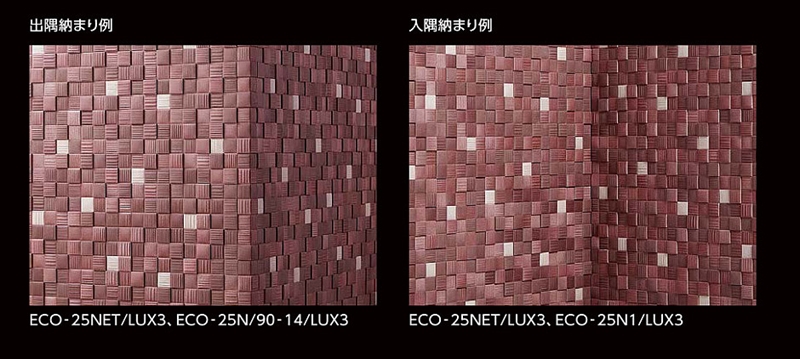 アクセント色を散りばめた表情豊かなモザイクが、贅沢な空間を演出します。 商品の留意点 ●エコカラットの共通注意事項(P.28)をご覧ください。 ●素材の風合いを出すために大きな色幅があります。 ●シート寸法は303×303mmです。割付けの際はシート単位で割り付けてください。 ●小端には、加飾を施していませんので、表面とは色合いが異なります。現物サンプルにてご確認ください。 ●この商品は複数のレリーフ面状をミックスしています。 ●LUX2、LUX3、LUX4には方向性があり、左上に明るい色のピースが並ぶ向きが上向きで標準の施工方法です。 ●レリーフの方向はランダムになるようにしてありますが、レリーフの方向がそろう場合もあります。 ●90°曲の内寸は、厚さにかかわらず(19.25+19.25)×25.25mmです。 ●25角(納まり役物)は、入隅部分に同一厚さの粒をそろえることで、入隅の凹凸を軽減する役物ですが、意匠がついているため完全にフラットになるわけではありません。 施工上のご注意 ●接着剤は「スーパーエコぬーるG」をご使用ください。 ●厚さに差がありますので、接着後よく押し込んで接着剤と付着させてください。 ●色番LUX1は白を基調としているため、汚れには十分注意して施工してください。