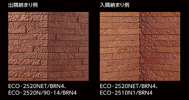 土を手で荒らしたような意匠が、ナチュラルで素朴な空間にお薦めです。 商品の留意点 ●エコカラットの共通注意事項(P.28)をご覧ください。 ●素材の風合いを出すために大きな色幅があります。 ●この商品は縦・横とも目地幅を1.0mm程度あける仕様になっており、裏ネットや接着剤のクシ目などが見えます。 ●小端には、加飾を施していませんので、表面とは色合いが異なります。現物サンプルにてご確認ください。 ●この商品は複数のレリーフ面状をミックスしています。 ●90°曲の内寸は、(94.5+27.5)×24.25mmと(61+61)×24.25mmになります。 ●25×101角片面小端施釉(短辺)ネット張りは、入隅部分に同一厚さの粒をそろえることで、入隅の凹凸を軽減する役物ですが、意匠がついているため完全にフラットになるわけではありません。 施工上のご注意 ●接着剤は「スーパーエコぬーるG」をご使用ください。 ●シートの上下に方向性がありますので、施工パターンにしたがって張ってください。 ●シート間は縦・横ともに1.0mm程度あける仕様になっていますが、シート内の目地幅とそろえるように施工するとシート間のつなぎ目が目立たなくなります。 ●エコカラット間に隙間があいていますので、接着剤は、エコカラットの長手方向に平行にクシ目を立てると、クシ目が目立ちにくくなります。 ●厚さに差がありますので、接着後ひとつひとつよく押し込んで接着剤と付着させてください。 ●色番BRN1は白を基調としているため、汚れには十分注意して施工してください。