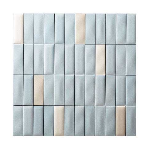 きらきらした表情と3色ミックスパターンが、明るく優しい雰囲気をつくります。 商品の留意点 ●エコカラットの共通注意事項(P.28)をご覧ください。 ●この商品は縦・横とも目地幅を1.0mm程度あける仕様になっており、裏ネットや接着剤のクシ目などが見えます。 ●シートには方向性があり、左上に白色のピースが並ぶ向きが上向きで標準の施工方法です。 ●90°曲の内寸は、(19.75+19.75)×74.75mmです。 ●パールの質感を持ち、複数のレリーフ面状をミックスしています。 ●25×75角(納まり役物)は、入隅部分に同一のレリーフ面状をそろえることで、入隅の凹凸を軽減する役物ですが、レリーフがついているため完全にフラットになるわけではありません。 施工上のご注意 ●接着剤は「スーパーエコぬーるG」をご使用ください。 ●シート間は縦・横ともに1.0mm程度あける仕様になっていますが、シート内の目地幅と揃えるように施工するときれいに仕上がります。 ●エコカラット間に隙間があいていますので、接着剤は、エコカラットの長手方向に平行にクシ目を立てると、クシ目が目立ちにくくなります。