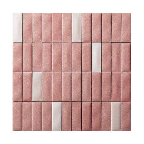 きらきらした表情と3色ミックスパターンが、明るく優しい雰囲気をつくります。 商品の留意点 ●エコカラットの共通注意事項(P.28)をご覧ください。 ●この商品は縦・横とも目地幅を1.0mm程度あける仕様になっており、裏ネットや接着剤のクシ目などが見えます。 ●シートには方向性があり、左上に白色のピースが並ぶ向きが上向きで標準の施工方法です。 ●90°曲の内寸は、(19.75+19.75)×74.75mmです。 ●パールの質感を持ち、複数のレリーフ面状をミックスしています。 ●25×75角(納まり役物)は、入隅部分に同一のレリーフ面状をそろえることで、入隅の凹凸を軽減する役物ですが、レリーフがついているため完全にフラットになるわけではありません。 施工上のご注意 ●接着剤は「スーパーエコぬーるG」をご使用ください。 ●シート間は縦・横ともに1.0mm程度あける仕様になっていますが、シート内の目地幅と揃えるように施工するときれいに仕上がります。 ●エコカラット間に隙間があいていますので、接着剤は、エコカラットの長手方向に平行にクシ目を立てると、クシ目が目立ちにくくなります。