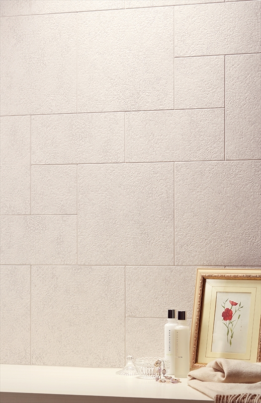 ヴィンテージ感のあるレリーフが上質な空間を演出します。 商品の留意点 ●エコカラットの共通注意事項(P.28)をご覧ください。 ●素材の風合いを出すために大きな色幅があります。 ●片面小端仕上げの小端面は、タッチアップ仕上げとなっています。 ●異形状セットはバラ出荷できません。303角平、303×151角平、151角平をご利用ください。 施工上のご注意 ●接着剤は「スーパーエコぬーるG」をご使用ください。 ●セット品番を確認し、そのパターン図をご参照の上、施工してください。 ●色番LAY1は白を基調としているため、汚れには十分注意して施工してください