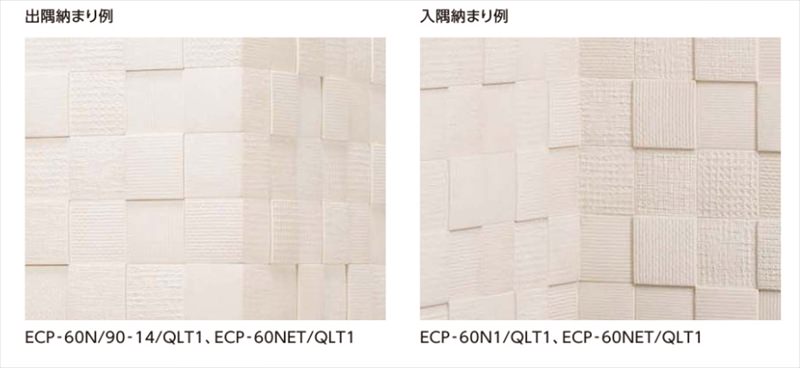 ●60角(納まり役物)は、入隅部分に同一厚さの粒をそろえることで、入隅の凹凸を軽減する役物ですが、意匠がついているため完全にフラットになるわけではありません。