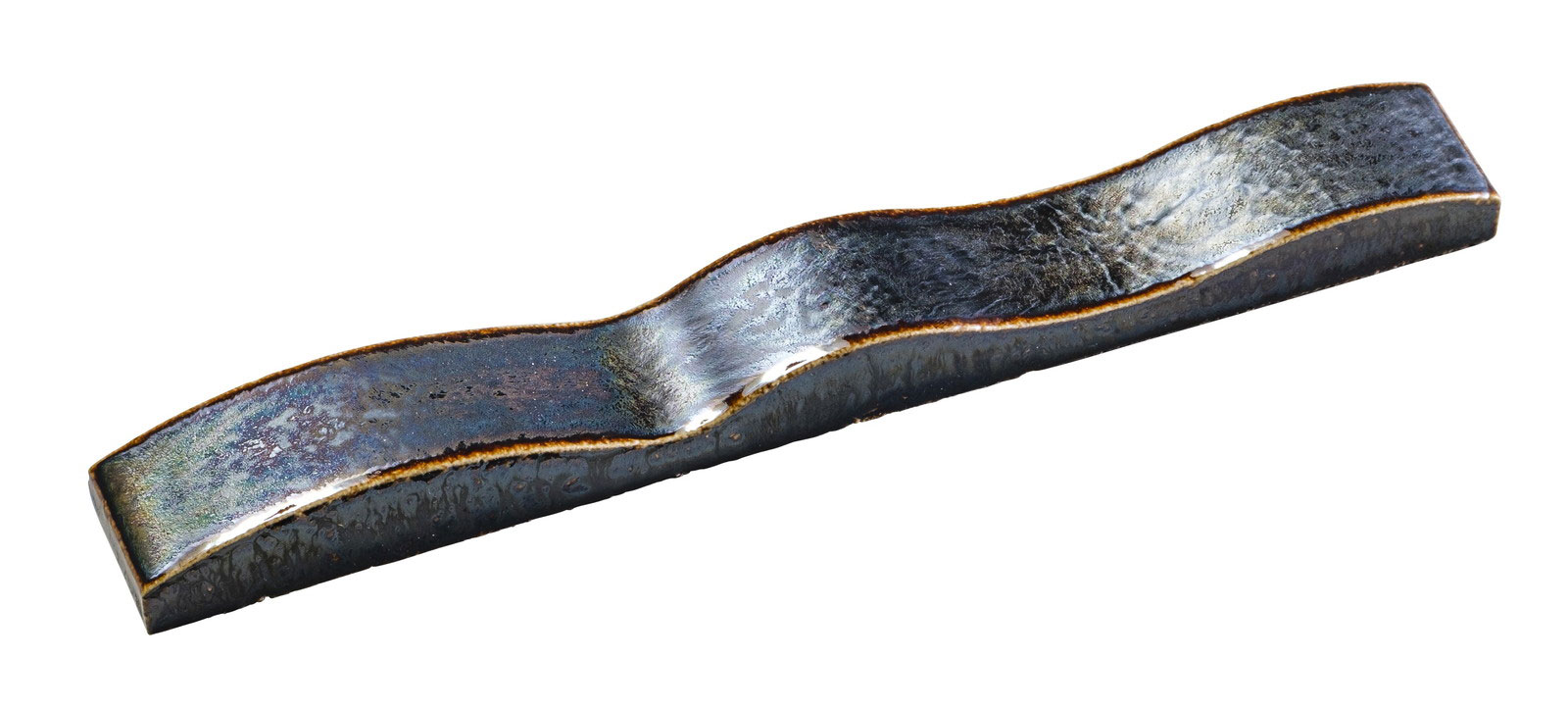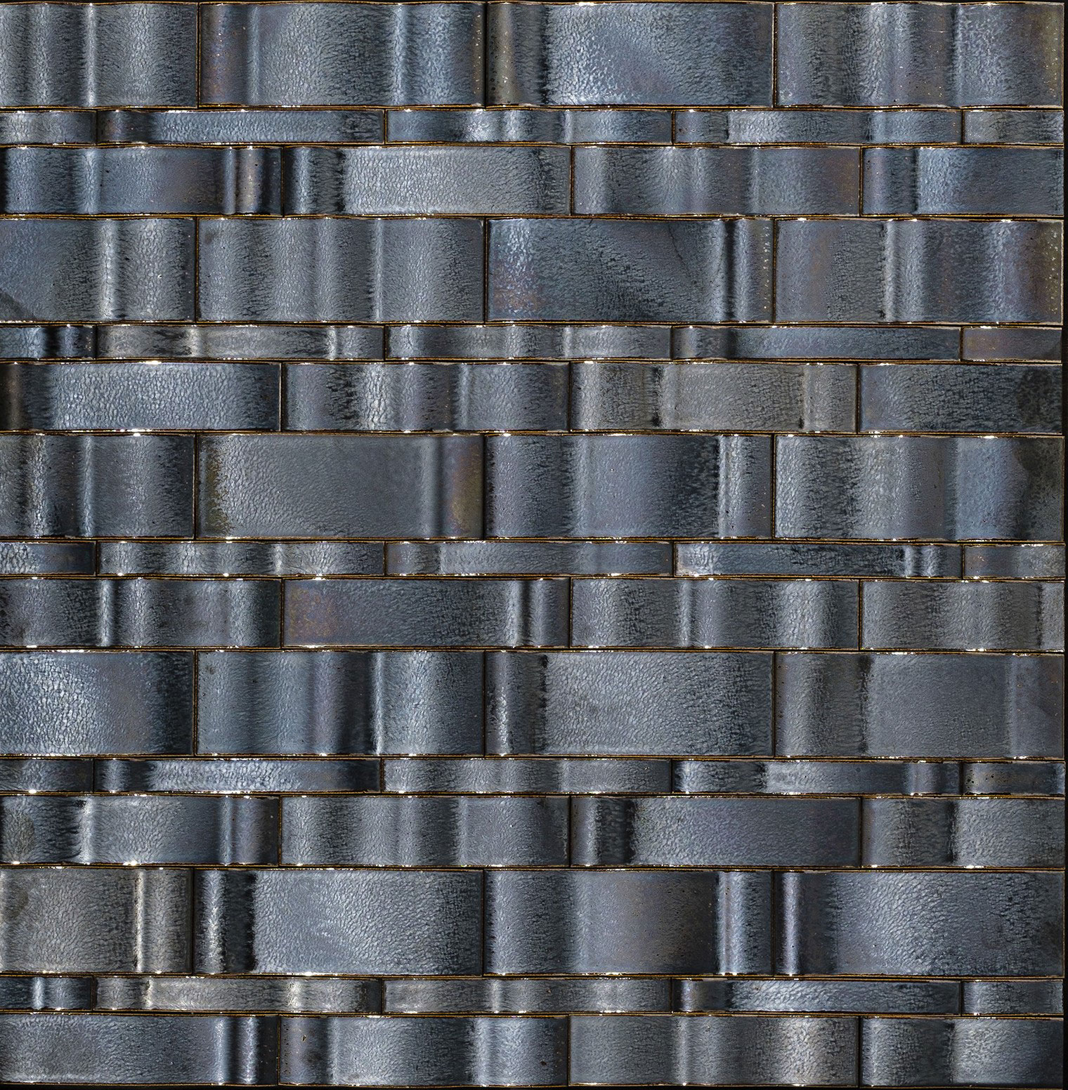 不規則な面状のタイルに金属釉を施しました。ダイナミックな形状と神秘的な色彩で、ラグジュアリーな空間を演出します。 ■注意事項■ <注意点> ●押出成形による切出製法ですので寸法形状にバラつきがあります。 調整しながら施工願います。 ●焼物特有の色幅があります。 ●3種類のウェーブ面状がランダムミックスされています。 ●接着剤貼りを推奨いたします。