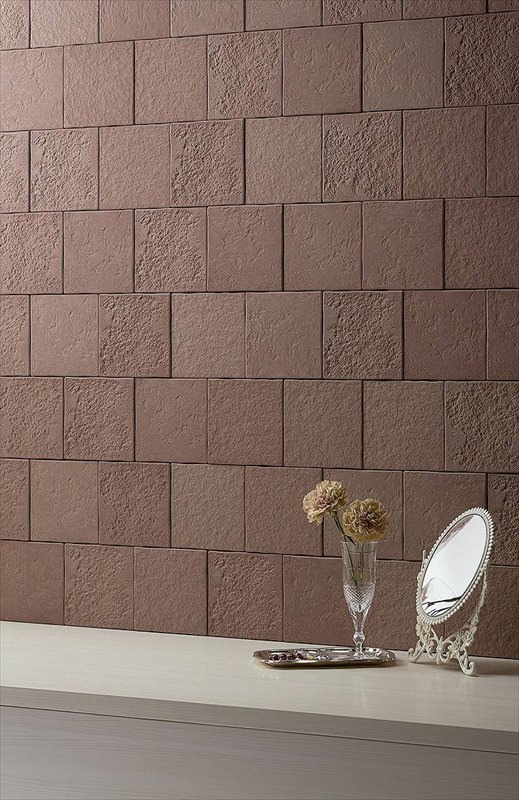 時を経て風化したような表情と落ち着いたカラーバリエーションが特長です。 商品の留意点 ●エコカラットプラスの共通注意事項(カタログ)をご覧ください。 ●馬張り専用品です。通し目地で施工すると目地の交点に大きな隙間ができます。 ●自然な土の風合いを出すために部分的に柄模様を施しています。特に、色番CRC1は、白色のベース層の凸部に茶色を重ねた意匠となります。 ●素材の風合いを出すために大きな色幅があります。 ●この商品は目地幅を1.0mm程度あける仕様になっていますが、外周がラウンドしており、部分的に数ミリ程度目地があき、目地部からは接着剤などが見えます。 ●小端には、加飾を施していませんので、表面とは色合いが異なります。現物サンプルにてご確認ください。 ●この商品は複数のレリーフ面状をミックスしています。 ●出隅セット、片面小端仕上げセットの小端面は、タッチアップ仕上げとなっています。 ●見切り材を使用しないで壁の途中から施工する際、左右端部には片面小端仕上げセットをご使用ください。 施工上のご注意 ●接着剤は「スーパーエコぬーるG」をご使用ください。 ●接着剤は、5mmくし目コテを使用し、平押えで施工してください。 ●色番CRC1は白を基調としているため、汚れには十分注意して施工してください。