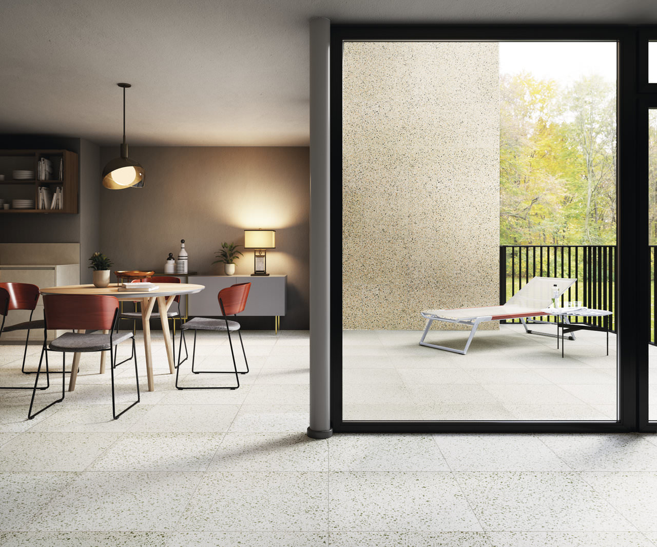 小さめのチップが練りこまれたテラゾー調タイル。珍しい”洗い出し風”のフレーム仕上げもご用意。 ■環境配慮品 ・グリーンガード取得 ・LEED評価寄与商品(原料リサイクル率:40%以上) ・EPD宣言商品 ■注意事項■ ●受注輸入品は納期3ヶ月以上・各色・各サイズ・各仕上げ80m2以上で承ります。(80m2以下は別途お見積もりにて対応) ●チップの大きさに自然なバラつきがあります。 ●色調に自然なバラつきがあります。 ●磨き仕上げは、本磨きではなくツヤ感が強くない仕上げとなっています。 ●異なる製造ロットでは、数ケースミックスして色調を整えてから施工してください。 ●596×1,196mmサイズを高所壁面へ施工の際は、使用環境に応じて縦張りができない場合があります。