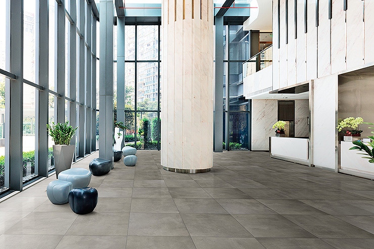 ジュラストーン、コンクリート2種類のデザインテイストを持つ大型形状の床タイルが解放感ある空間を演出します。 <商品の留意点> ●輸入品のため、生産ロット単位や形状間で色合い・光沢が異なる場合があります。 ●800角平は、外床タイプにはありません。 ●輸入元メーカーの梱包での出荷となります。 <施工上のご注意> ●3mm以上の目地幅をとって施工してください。ただし、居室床(靴ばき以外)および壁面に使用の場合は5mm以上の目地幅をとって施工してください。 ●タイルをずらして施工する場合は200mm以内に抑えてください。