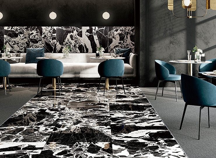 黒さ・白さが際立つ大理石の筋模様や光沢を忠実に再現した床タイルです。