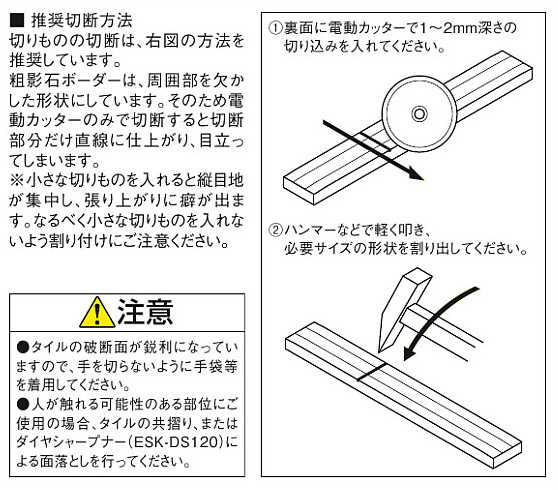 屋内壁 : ○ 屋内床 : ○ 浴室床 : × 屋外壁 : × 屋外床 : ◎ 耐凍害適正 : ○ |