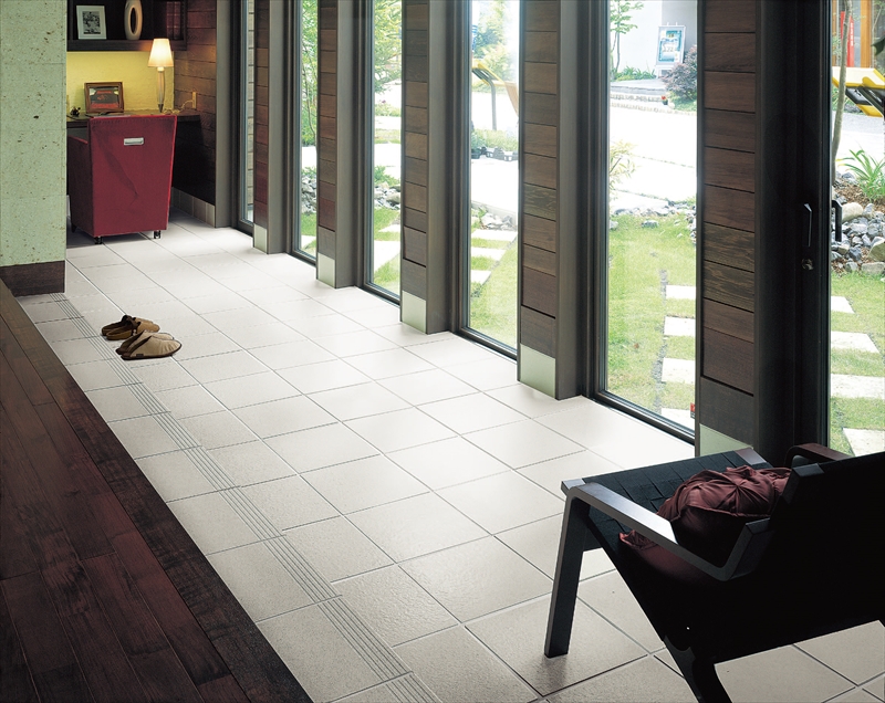 御影石をイメージした面状は充分な存在感を放ちます。 フロアタイルの新しいスタンダードです。 【注意事項】 ●焼きもの特有の色幅があります。 ●タレ付階段は接着加工品となります。 【施工上のご注意】 ●製品には多少の寸法誤差があります。 施工の際に5mm程度の目地をおとりください。