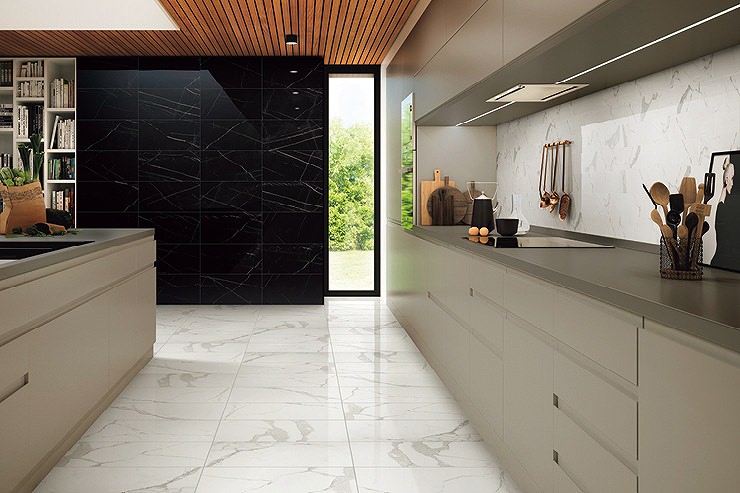 シャープなエッジが特徴の大理石調磨きタイルです。トレンドのグレージュやブルーのオニキス、定番でモノトーンのスタッチャリオやマルキーナをラインアップしました。
