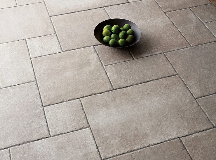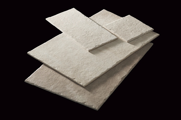 南欧風の柔らかい石材の表情をしたタイルです。4種類の形状を組み合わせたフレンチパターンが特徴です。