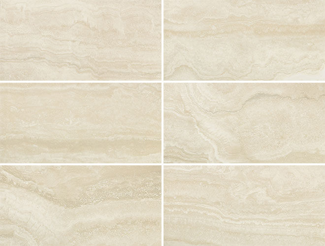 大理石のトラバーチンの石目に沿って刃を入れるベインカットの脈模様が特徴の大理石調タイルです。 ■注意事項■ ●流れ模様が一定方向に入っています。 ●色幅の大きい商品になるため仮並べしてからの施工を強く推奨します。