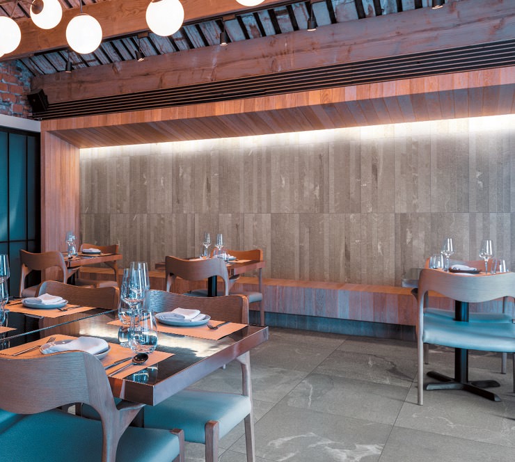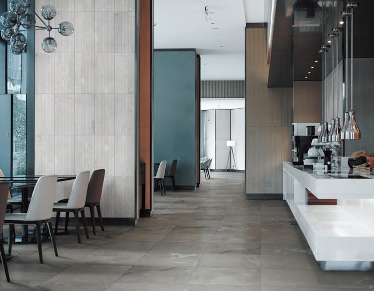 小さな石の粒や大理石・スレート柄を重ね合わせた、穏やかさとダイナミクスが調和するデザインで、モダン空間にお薦めです。