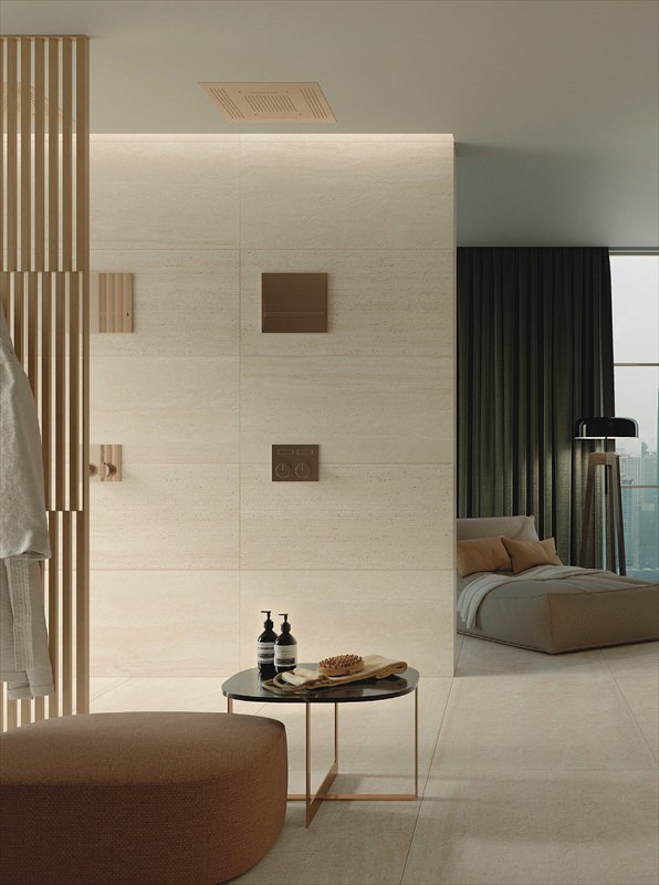 長方形のフォルムと豊かなパターンが魅力のトラバーチン調インクジェットタイル。