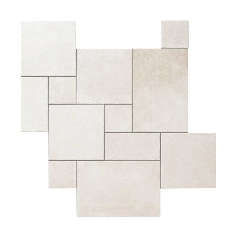 南欧風の柔らかい石材の表情をしたタイルです。4種類の形状を組み合わせたフレンチパターンが特徴です。