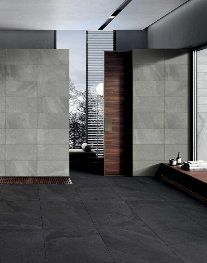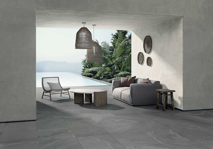 黒の石目が特徴のブラジリアンスレートをモチーフにしたタイルです。内外空間にご使用いただけます。