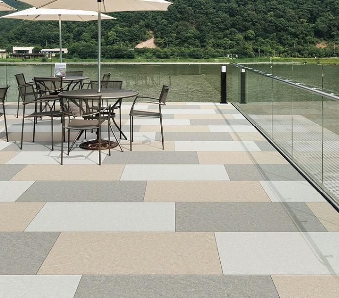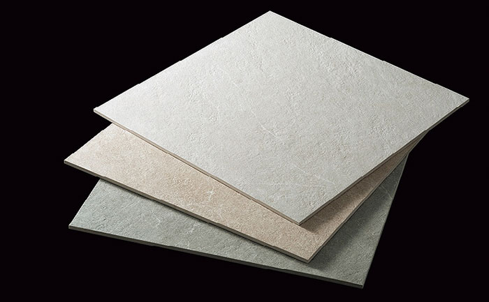 屋外にも使用可能な1200×600サイズを持つライムストーン調タイルです。内外空間をつなげて使用できます。